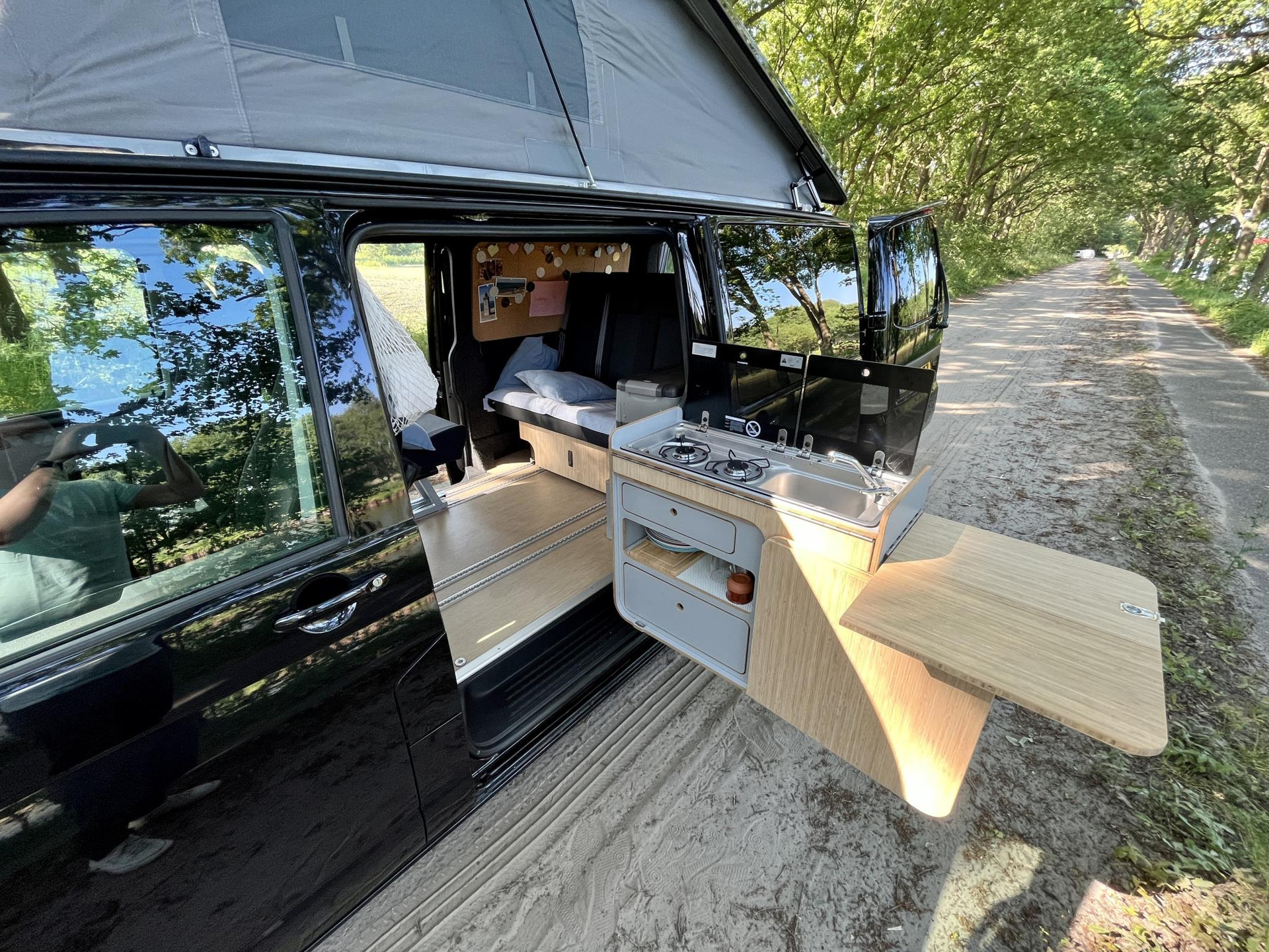 Zoals u van een Tonke camperbus mag verwachten, is deze VAN XL voorzien van wit meubilair en witte keukenkastjes gemaakt van hoogwaardig berkenhout met een krasvast en hittebestendige kunststof afwerking. Uiteraard ligt de focus niet alleen op binnen. Door de naar buiten draaiende keuken is deze in enkele seconden omgetoverd tot een buitenkeuken. Deze is voorzien van 2 gaspitjes, een spoelbak met kraantje én een royaal werkblad.