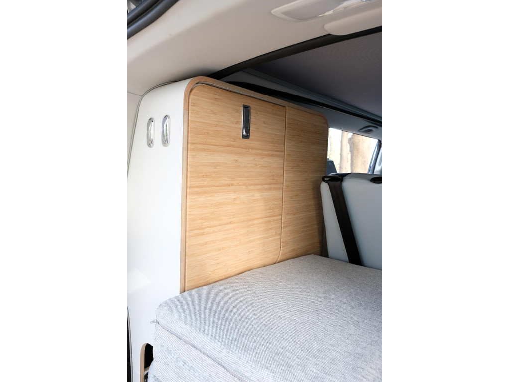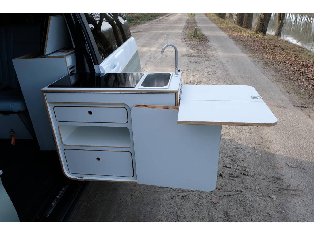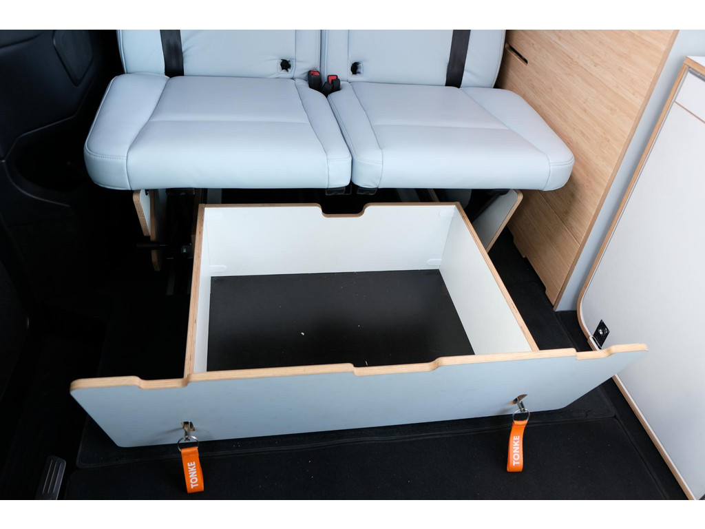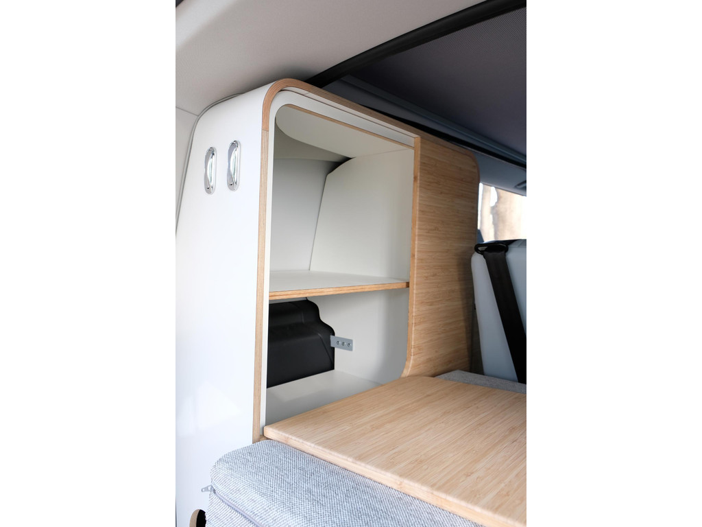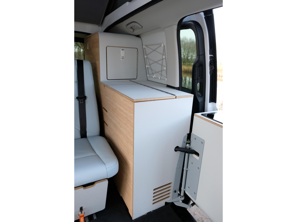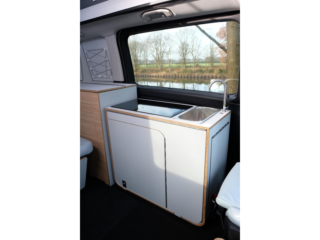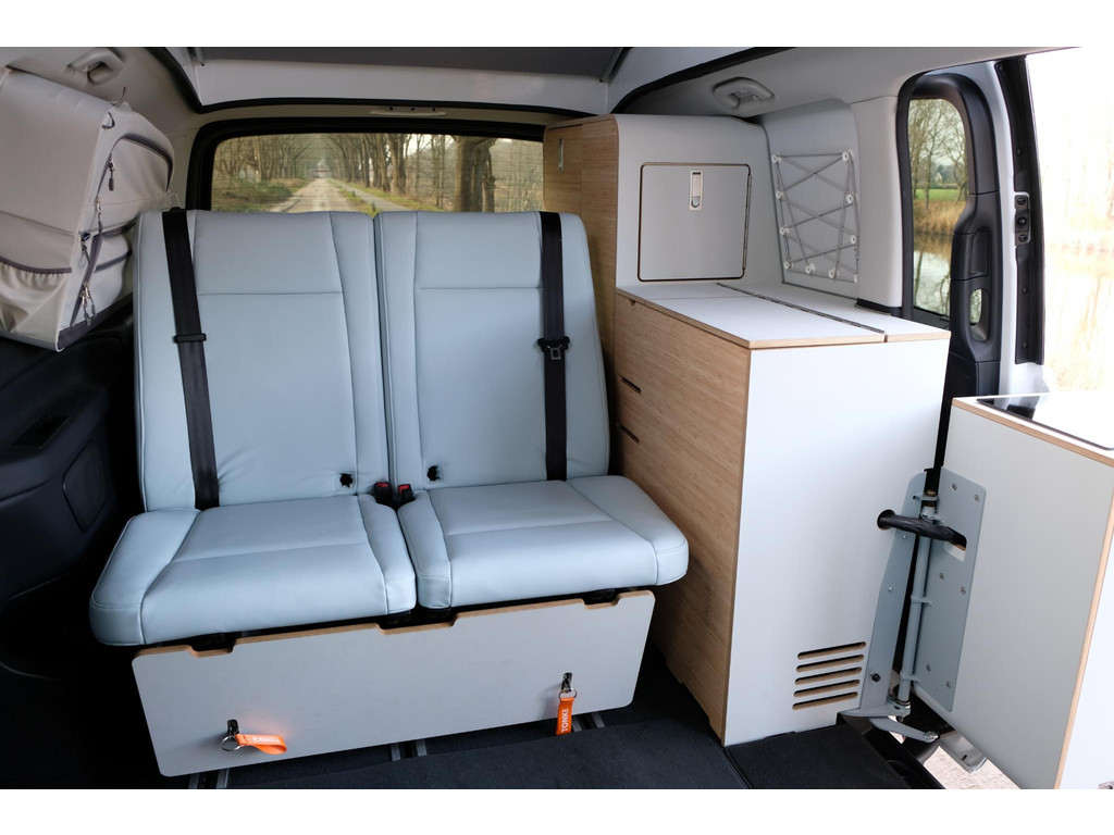 Het interieur springt direct in het oog. De lichtblauwe vegan leather stoelen en achterbank geven de camper een frisse, moderne uitstraling, terwijl het hefdak en de neerklapbare achterbank zorgen voor twee comfortabele slaapplaatsen boven én beneden. Dankzij de naar buiten draaiende keuken kook je eenvoudig in de buitenlucht, met voldoende opbergruimte in de achterste lade en onder de bank om alles netjes mee te nemen.
