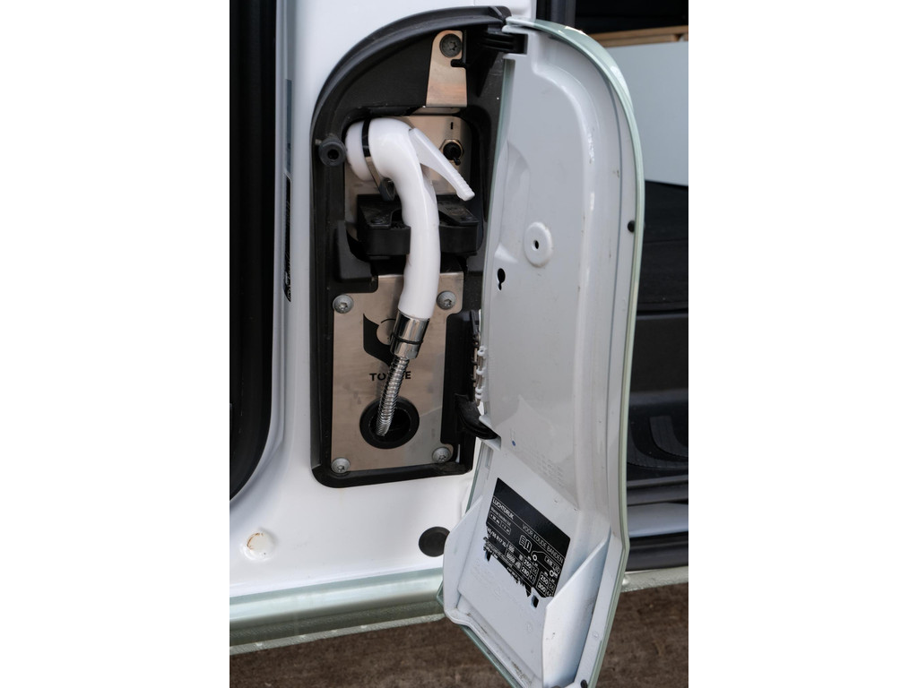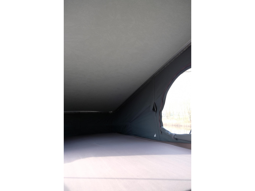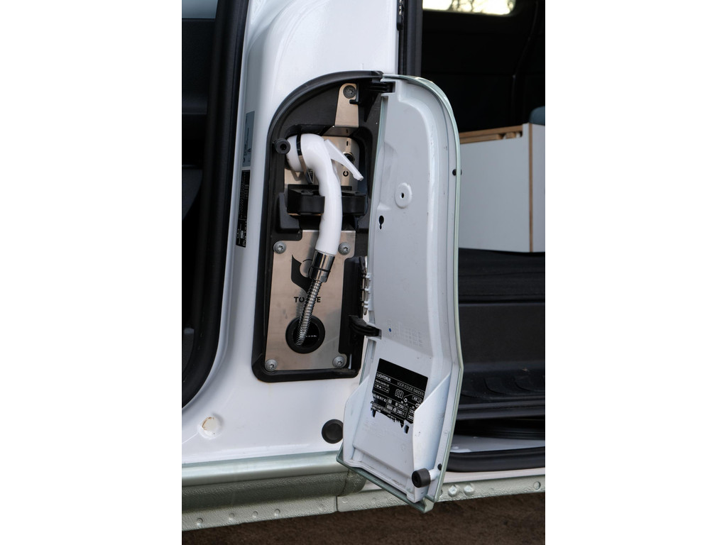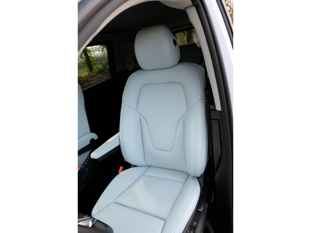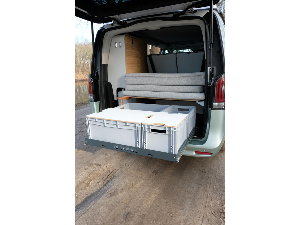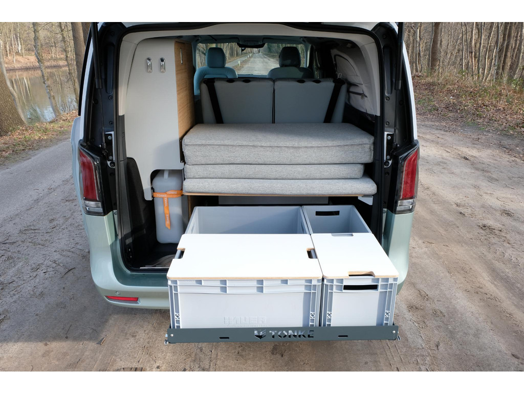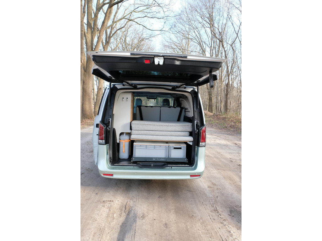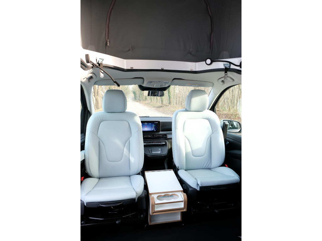 Het interieur springt direct in het oog. De lichtblauwe vegan leather stoelen en achterbank geven de camper een frisse, moderne uitstraling, terwijl het hefdak en de neerklapbare achterbank zorgen voor twee comfortabele slaapplaatsen boven én beneden. Dankzij de naar buiten draaiende keuken kook je eenvoudig in de buitenlucht, met voldoende opbergruimte in de achterste lade en onder de bank om alles netjes mee te nemen.