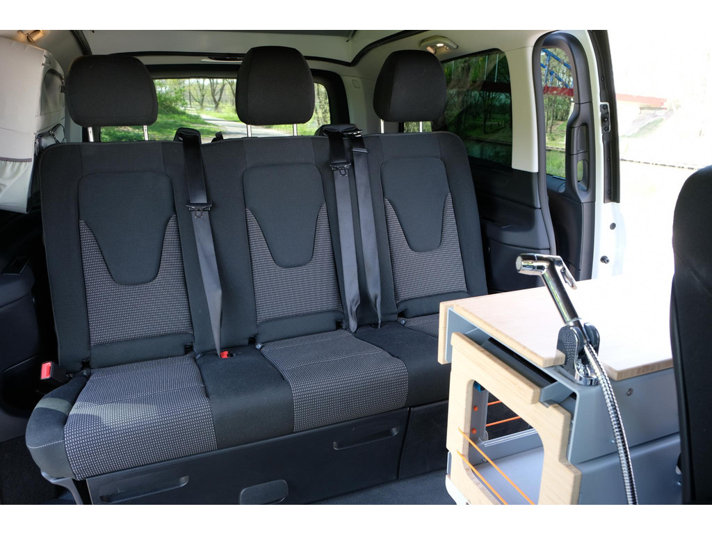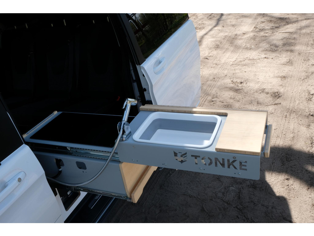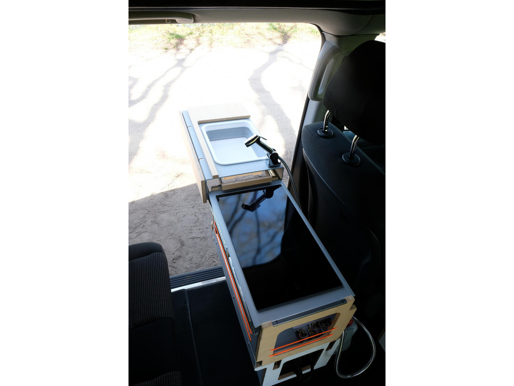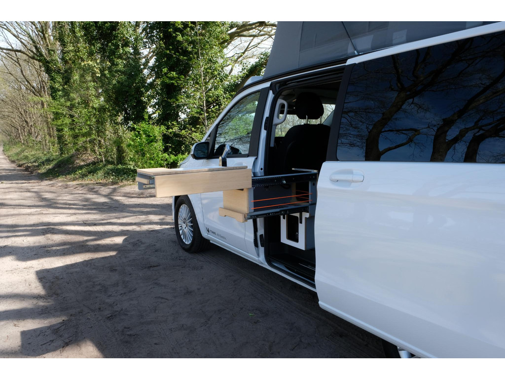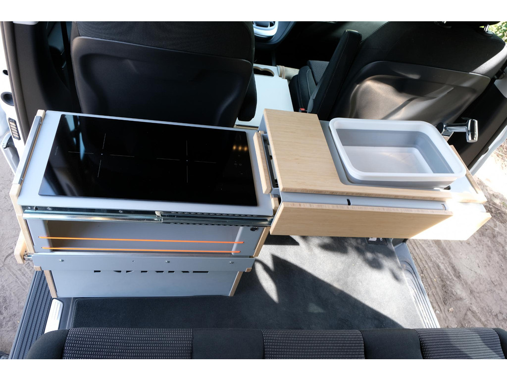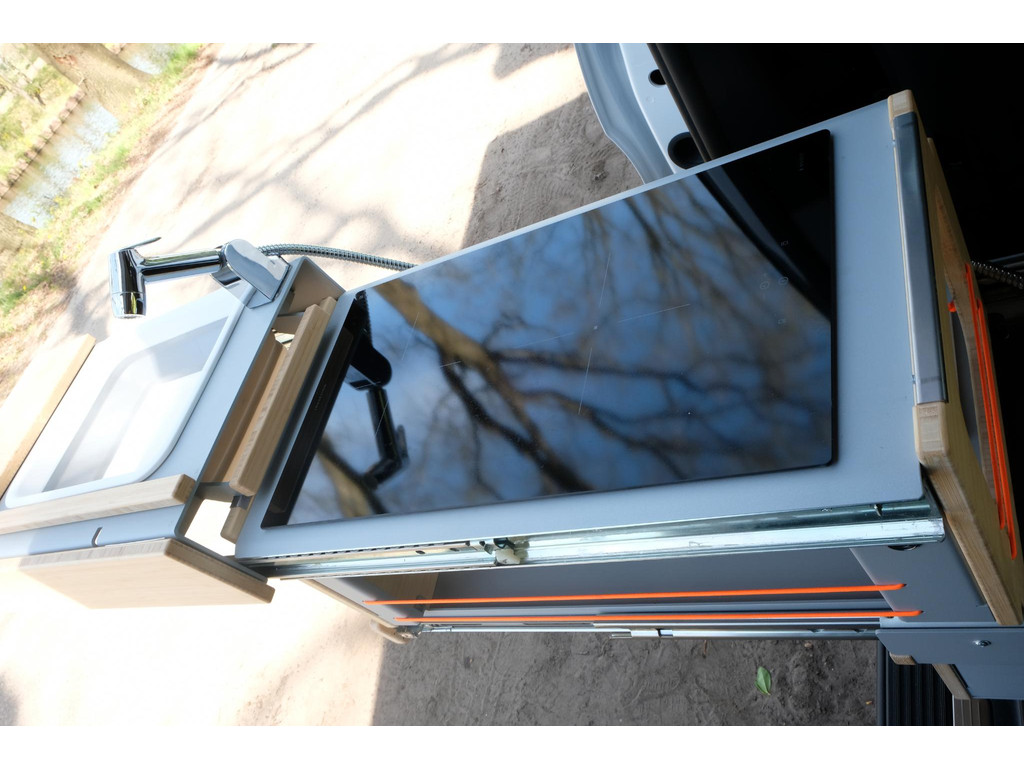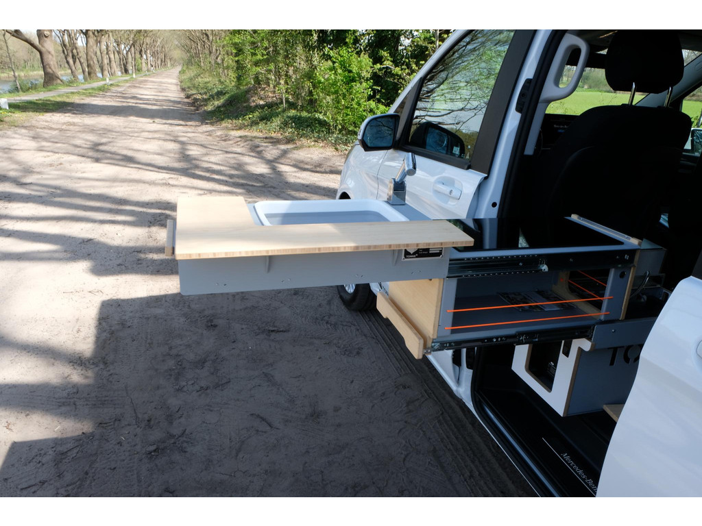 Aan de achterzijde van de bestuurdersstoel vind je de kenmerkende Nomad keuken. Compact, stijlvol en verrassend compleet. Alles is logisch geplaatst zodat koken onderweg eenvoudig en fijn blijft, of je nu op een camping staat of midden in de natuur.